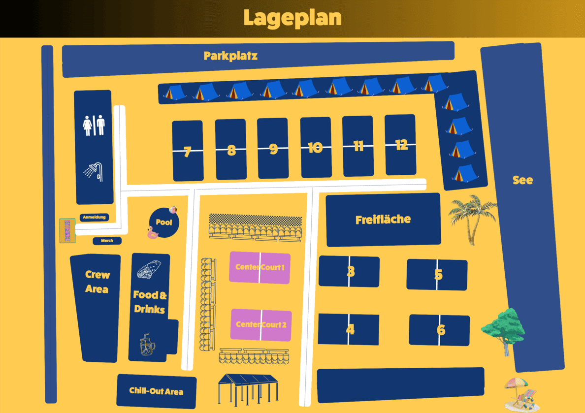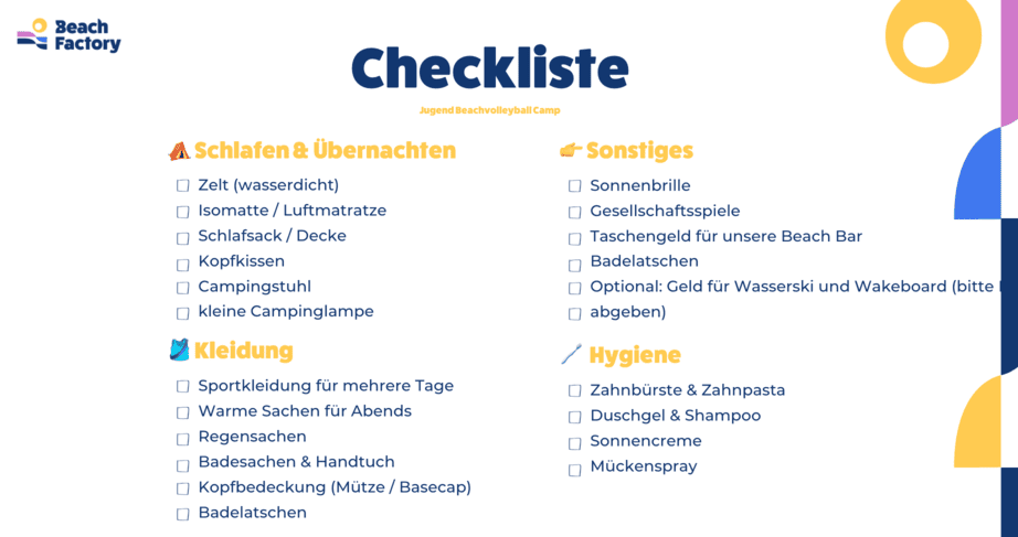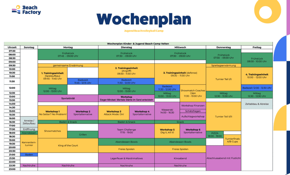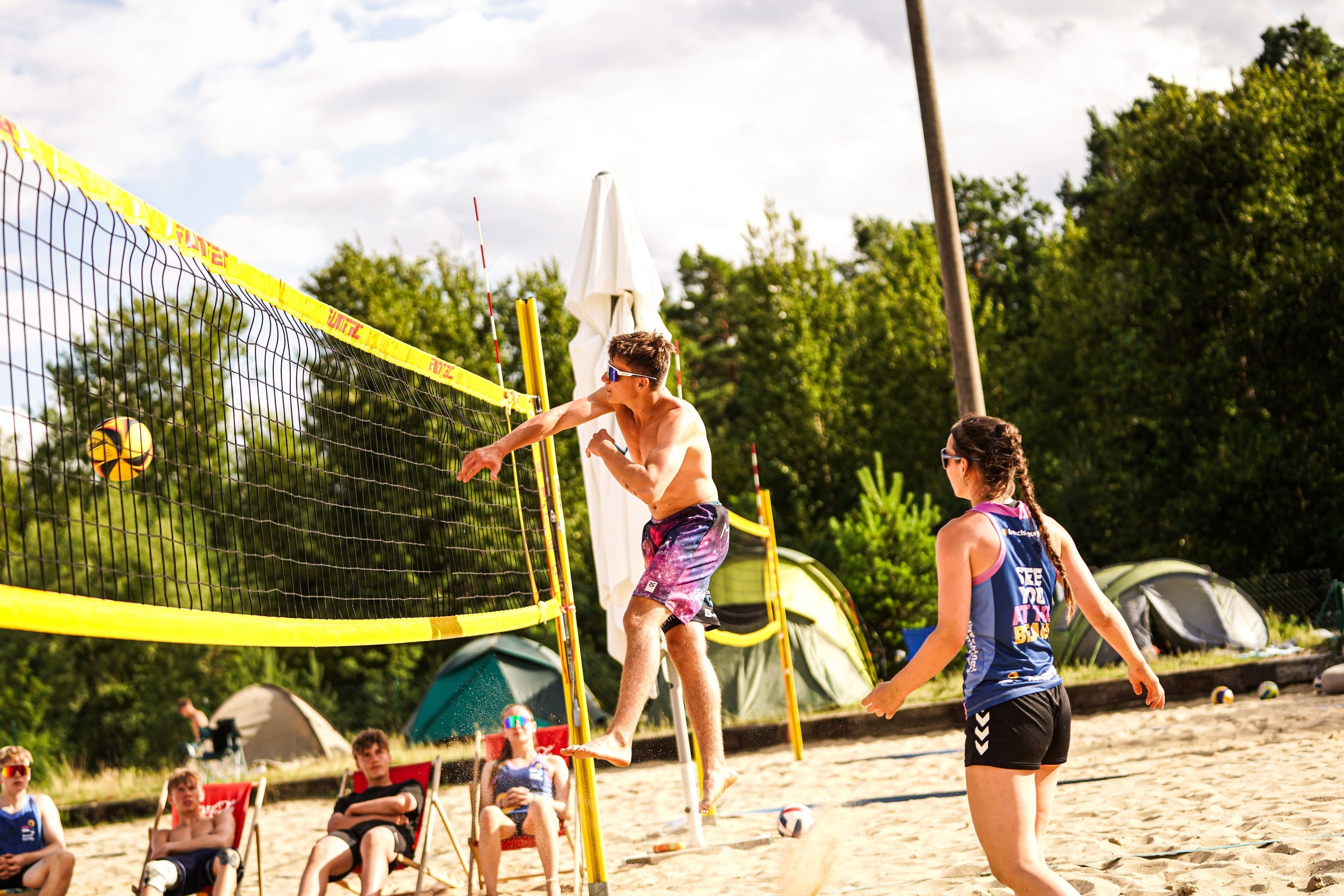 Turniere (u. a. King-of-the-Court & Hauptturnier), Baden in beaufsichtigten Zeiten, Grillen & Lagerfeuer, Gesellschaftsspiele, Spikeball, Beach Soccer, Frisbee.